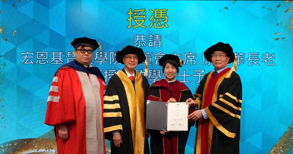 宏恩基督教學院校董會主席原樹華長老 (左二) 頒授教牧學博士證書給陳秀琴女士 (右二);旁為宏